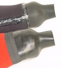 Latex seals are available in two different shapes (as well as standard and heavy duty thickness).Bottle seals have a 40mm parallel section at the end which sit comfortably on the wrist. We have fitted bottle wrists as the nom for many years and when correctly sized to the wearer, they offer a good balance between comfort, wrist sealing and ease of dressing. There are some people who prefer the cone type as they feel that the tapered end “bites” more firmly into the skin of the wrist giving a better seal this high fitting up the wrist also can reduce any interference from under suit sleeve ends. The smaller sealing area of cone seals can avoid the channels caused by wrist tendons that can cause leaks with some divers. Cone wrist have ring trimming guides to further adjust the fit. The shoulder section of bottles seals makes the fitting of any dryglove ring system much easier.